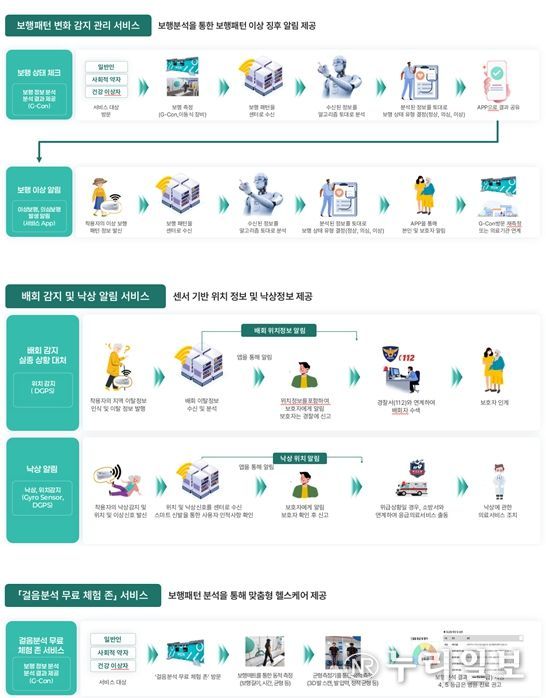한편, '사물 인터넷(IoT)기반 스마트신발을 활용한 사회적약자 지원서비스 사업'은 65세 이상 고령자 500명을 대상으로, 보행 측정이 가능한 스마트센서(자이로센서-보행 분석, GPS센서-위치정보)가 부착된 스마트신발을 보급해 보행 패턴 변화를 관리하는 실증 서비스다.