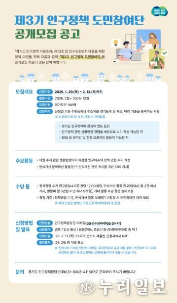 (누리일보) 경기도가 정책 대상자가 직접 정책개선에 참여하는 ‘제3기 인구정책 도민참여단’ 100명을 공개 모집한다.