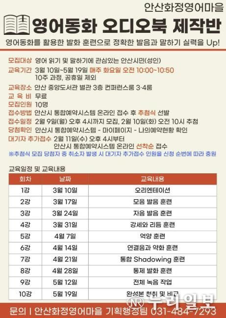 (누리일보) 안산시가 설립하고 안산대학교가 운영하는 안산화정영어마을이 성인 영어 학습자를 위한 ‘영어동화 오디오북 제작반’을 3월부터 5월까지 10주 과정으로 안산시 중앙도서관에서 운영한다고 4일 밝혔다.