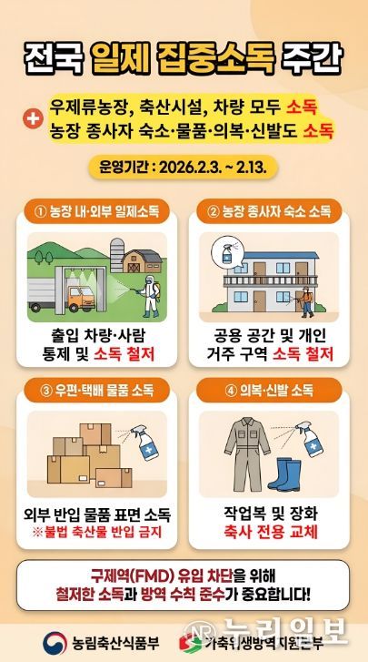 (누리일보) 경상남도는 1월 31일 인천 강화군 소재 소 사육농장에서 올해 첫 구제역이 확진됨에 따라 도내 유입 차단을 위한 선제적 방역 강화 조치에 돌입한다고 밝혔다.