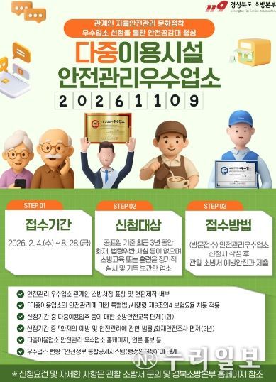 (누리일보) 경상북도소방본부는 자율안전관리 문화 정착을 위한 ‘다중이용업소 안전관리 우수업소’ 신규 신청을 오는 8월 28일까지 접수한다고 밝혔다.