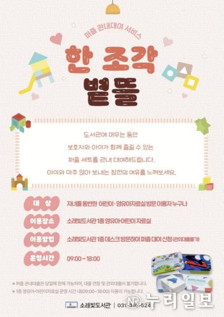 (누리일보) 시흥시 소래빛도서관은 어린이를 위한 관내 퍼즐 대여 서비스 ‘한 조각 볕뜰’을 새롭게 선보인다. 이 서비스는 빠른 영상과 즉각적인 자극에 익숙해진 아이들이 잠시 속도를 늦추고, 손끝 감각과 집중력을 자연스럽게 기를 수 있도록 마련됐다.