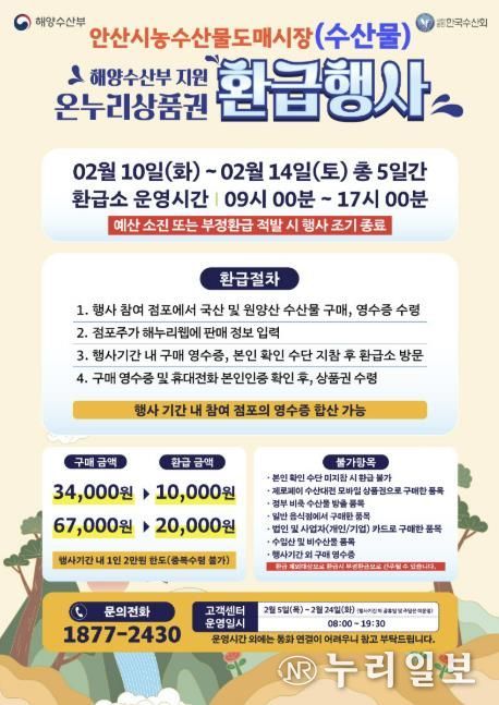(누리일보) 안산시는 설 명절을 맞아 국산 수산물 소비 촉진과 도매시장 활성화를 위해 오는 10일부터 14일까지 5일간 ‘2026년 설 온누리상품권 환급행사’를 개최한다고 5일 밝혔다.
