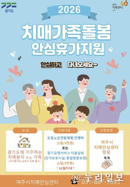 (누리일보) 여주시치매안심센터는 2026년에도 치매환자를 돌보는 가족이 잠시나마 돌봄에서 벗어나 휴식을 취할 수 있도록『치매가족돌봄 안심휴가제』를 지속적으로 운영한다.