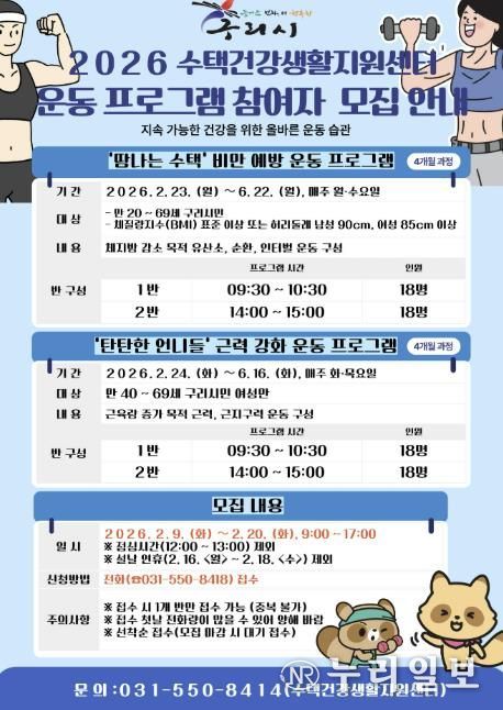 (누리일보) 구리시 수택건강생활지원센터는 오는 2월 9일부터 성인과 중장년층의 비만 예방과 근력 강화를 위한 맞춤형 운동프로그램인 ‘땀나는 수택’과 ‘탄탄한 언니들’의 참여자를 모집한다고 밝혔다.