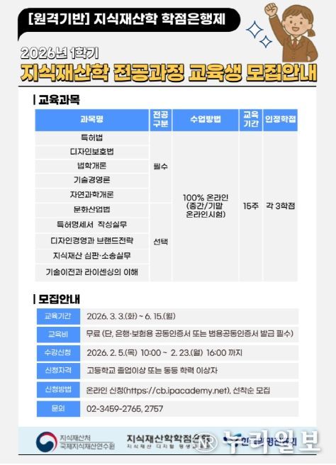 (누리일보) 지식재산처 국제지식재산연수원은 한국발명진흥회와 공동으로 2월 5일부터 23일까지 지식재산학 학점은행 과정에 대한 온라인 수강생을 모집한다.