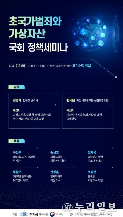 (누리일보) 관세청은 최기상 국회의원(더불어민주당·서울 금천구)과 공동으로 2월 5일 국회 의원회관에서 '초국가범죄와 가상자산: 국경을 넘어선 불법 자금 흐름 대응' 국회 정책 세미나를 개최했다.