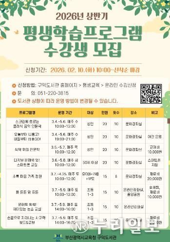 (누리일보) 부산광역시립구덕도서관은 3월부터 5월까지 유아와 성인 140여 명을 대상으로 구덕도서관에서 ‘2026년 상반기 평생학습 프로그램’을 운영한다.