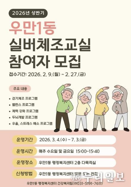 (누리일보) 수원시 팔달구 우만1동은 관내 어르신들의 건강 증진을 위해 2월 9일부터 2월 27일까지 ‘2026년 상반기 실버체조교실’ 참여자를 선착순으로 모집한다고 밝혔다.