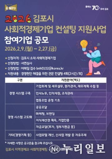 (누리일보) 김포시가 관내 사회적경제기업의 지속 가능한 성장과 자생력 강화를 위해 ‘사회적경제기업 역량강화 컨설팅 지원사업’ 참여기업을 오는 2월 27일까지 모집한다.