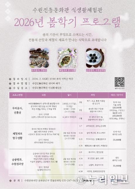 (누리일보) 수원문화재단은 오는 10일부터 수원전통문화관 식생활체험관 2026년 봄학기 프로그램 참여자를 모집한다. 이번 봄학기 프로그램은 계절의 변화에 맞춘 전통 식문화와 다양한 음식을 시민들이 쉽고 재미있게 경험할 수 있도록 기획했다. 전통장 담그기부터 제철 식재료 요리, 궁중병과 체험까지 다양한 내용으로 운영한다.