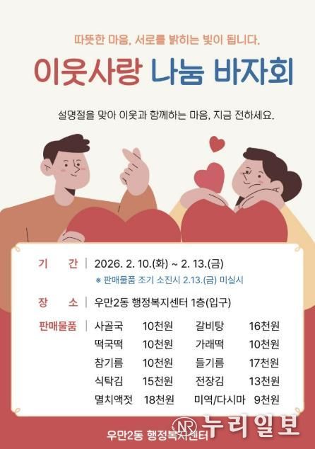 (누리일보) 수원시 팔달구 우만2동 지역사회보장협의체는 설 명절을 앞두고 오는 2월 10일부터 13일까지 우만2동 행정복지센터 청사 입구에서 ‘사랑나눔 바자회’를 개최한다고 밝혔다.