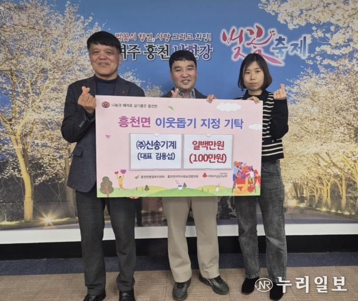 (누리일보) (주)신송기계는 설 명절을 앞두고 지역 내 어려운 이웃들이 따뜻한 명절을 보낼 수 있도록 이웃돕기 성금 100만 원을 흥천면행정복지센터에 기탁했다.