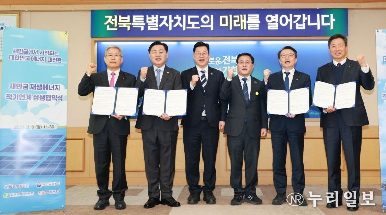 (누리일보) 전북특별자치도가 9일 도청에서 새만금개발청, 한국전력공사, 한국수력원자력㈜와 함께 '새만금 수상태양광(1단계) 발전사업'의 적기 구축을 위한 상호 협력 업무협약(MOU)을 체결했다.