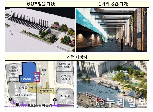 ‘감사의 정원’은 도로와 광장으로 도시계획시설 결정(중복 결정)되어 있는 세종대로 172(광화문 광장)에 조성되는 시설로, 지상에는 높이 약 7m 규모의 상징 조형물 22개를 설치하고, 지하에는 기존 지하 차량 출입구(램프)를 개보수하여 미디어월 등 전시공간(감사의 공간)을 설치하는 내용으로 계획되어 있으며 사업기간은 '24.4월부터 '26.4월까지(착공은 '25.9월)이다.