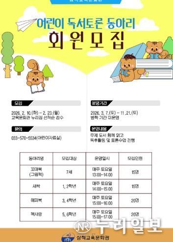 어린이 독서토론 동아리는 꼬마북(7세, 그림책), 새싹(1·2학년), 해피북(3·4학년), 책사랑(5·6학년) 총 4개 동아리로 구성해 매주 토요일 운영하며, 회원모집은 2월 10일부터 2월 23일까지 삼척교육문화관 누리집에서 선착순 접수로 진행된다.