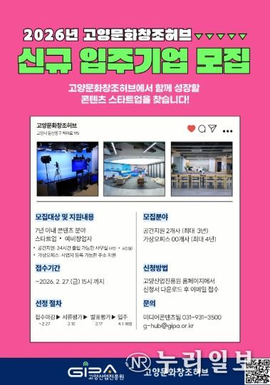 (누리일보) 고양특례시와 고양산업진흥원이 오는 27일 오후 3시까지 고양문화창조허브 신규 입주기업을 모집한다.