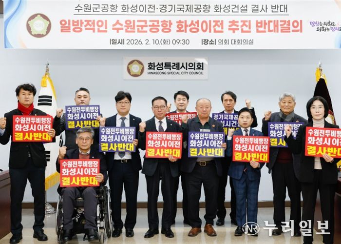 (누리일보) 화성특례시의회 수원 군공항 화성시 이전 반대 특별위원회는 10일 대회의실에서 수원시의 『수원군공항 이전 국가전략사업 추진』 및 『범정부 수원군공항 이전 TF 구성』 건의에 대한 반대 규탄 결의문을 발표했다.