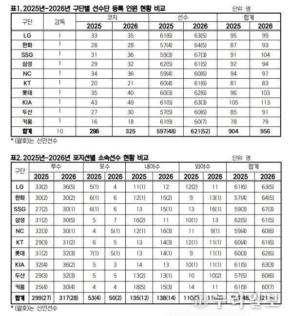 (누리일보) KBO는 2월 10일(화) 2026년 KBO 리그 소속 선수 명단을 공시했다. 10개 구단은 총 621명의 선수를 등록해, 597명이 등록했던 2025년보다 24명이 늘어났다.