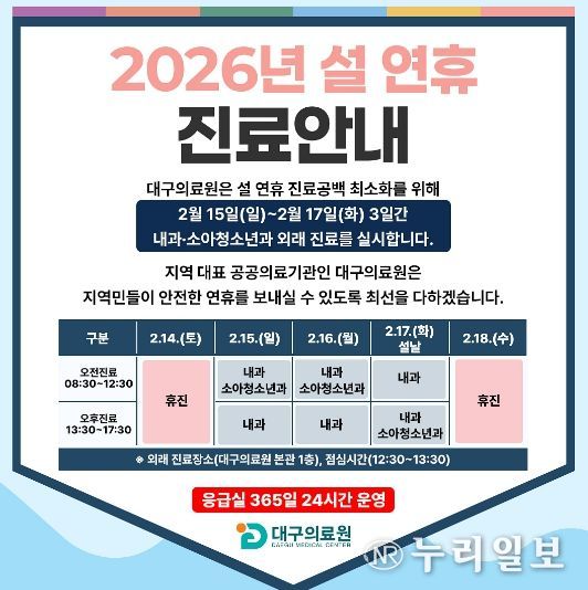 (누리일보) 대구의료원이 설 연휴 기간(2.14.~18.) 응급실 운영을 강화하고, 2월 15일~17일은 내과·소아청소년과 외래 진료를 실시한다.