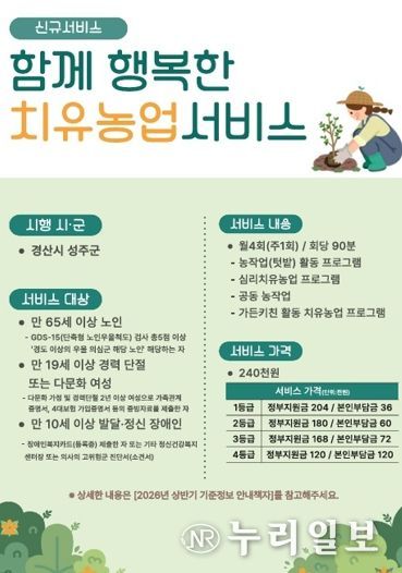 (누리일보) 경상북도농업기술원은 2026년부터 치유농업을 활용한 *지역사회서비스를 본격적으로 추진, 공공형 치유농업을 확산해 지역 주민 삶의 질 향상과 지속 가능한 치유 서비스 제공 체계를 마련한다.