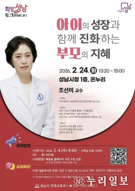 (누리일보) 성남시는 올해 첫 ‘희망성남 토크콘서트’ 강연자로 부모 교육 전문가로 평가받는 조선미 아주대학교 의과대학 정신건강의학 교실 교수를 초빙한다.