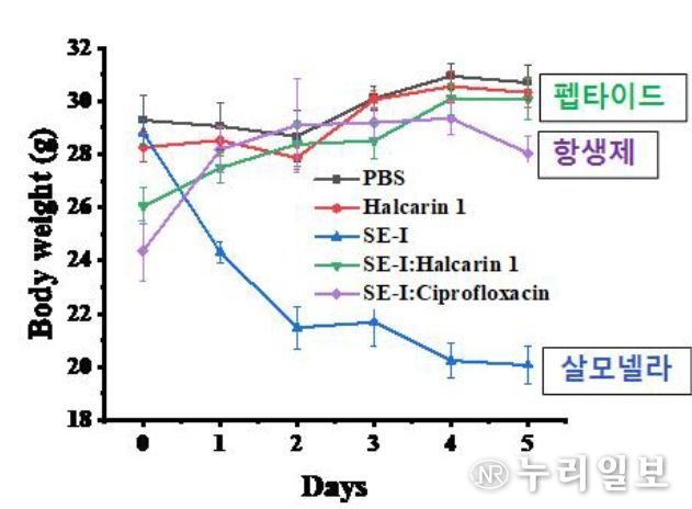 이번 연구 결과는 인공지능 기술로 찾아낸 펩타이드가 살모넬라 감염으로 인한 장 염증을 효과적으로 완화하는 것을 실험 결과로 확인했으며, 염증 유발 물질의 분비를 조절하고 장 점막을 보호하는 작용도 나타났다. 이로 인해 살모넬라 균에 의한 장질환 감소율은 기존 항생제인 키프로플록사신의 87.78%보다 높은 89.17%로 나타났다.