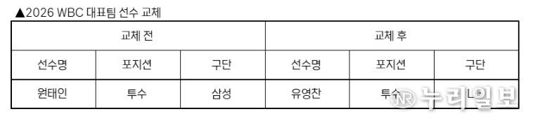 (누리일보) KBO 전력강화위원회는 부상으로 인해 WBC 참가가 어려워진 삼성 원태인을 대체할 선수로 LG 유영찬을 확정하고 WBC 조직위에 선수 교체 승인을 요청했다.
