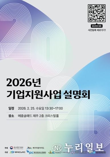 (누리일보) ◌ 제주테크노파크(원장 지영흔, 제주TP)는 오는 25일 오후 1시 30분부터 메종글래드 제주호텔 2층 크리스탈홀과 루비홀에서 주요 기업 지원사업을 소개하는 ‘2026년 기업지원사업설명회’를 개최한다고 19일 밝혔다.