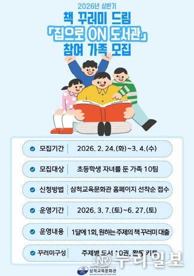 (누리일보) 삼척교육문화관은 3월부터 6월까지 가족 단위 독서 문화를 장려하기 위하여 초등학생 자녀를 둔 가족을 대상으로 책 꾸러미 드림 ‘집으로 온(ON) 도서관’을 운영한다.