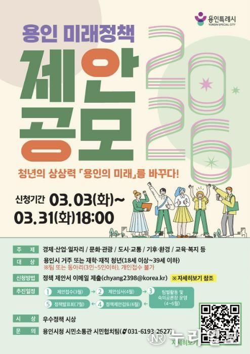 (누리일보) 용인특례시는 청년들이 직접 정책 설계에 참여해 도시의 미래 비전을 제시하는 ‘2026년 용인 미래정책 제안 공모전’을 개최한다고 23일 밝혔다.