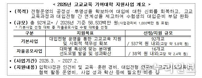 (누리일보) 교육부은 2월 24일, ‘2026년 고교교육 기여대학 지원사업 기본계획’을 발표한다.
