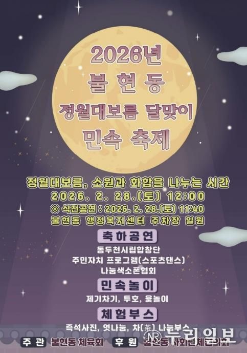 불현동 체육회는 오는 2월 28일 정오 불현동 행정복지센터 주차장에서 정월대보름 달맞이 민속 축제를 개최한다고 밝혔다.