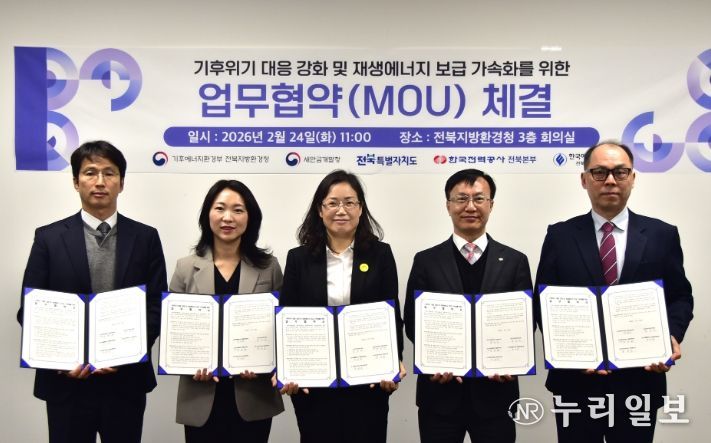 (누리일보) 전북특별자치도는 24일 전북지방환경청, 새만금개발청, 한국전력공사 전북본부, 한국에너지공단 전북지역본부와 함께 전북지역 재생에너지 보급 가속화를 위한 업무협약(MOU)을 체결하고, 기후위기 대응과 에너지 대전환 실현을 위한 협력에 나섰다.