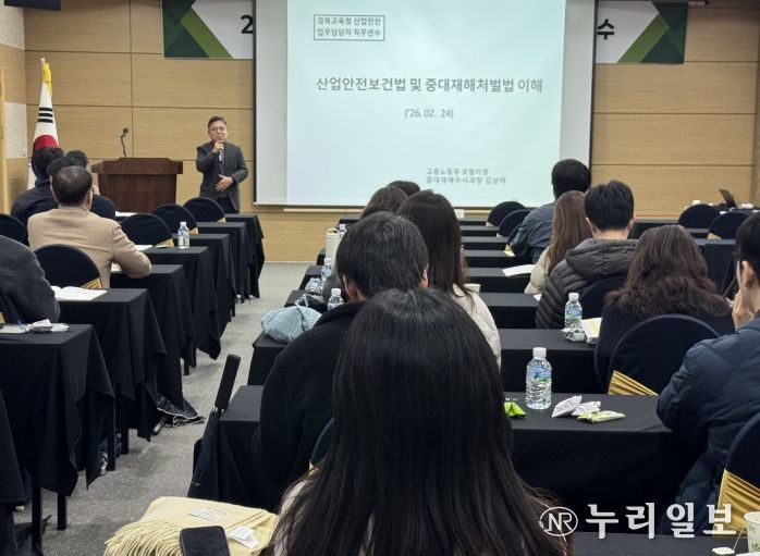 (누리일보) 경북교육청은 24일부터 25일까지 1박 2일간 경주시에 있는 더케이호텔경주에서 도내 22개 교육지원청 업무 담당자 44명을 대상으로 ‘2026 산업안전보건・중대재해 예방 직무연수’를 개최했다고 밝혔다.