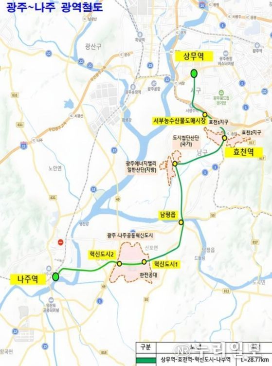 광주~나주 광역철도는 총사업비 1조 7천억 원을 투입해 광주 상무역을 출발해 효천역~도시첨단산단~남평읍~광주전남공동혁신도시를 거쳐 나주역까지 총연장 28.77㎞를 연결하는 사업이다.