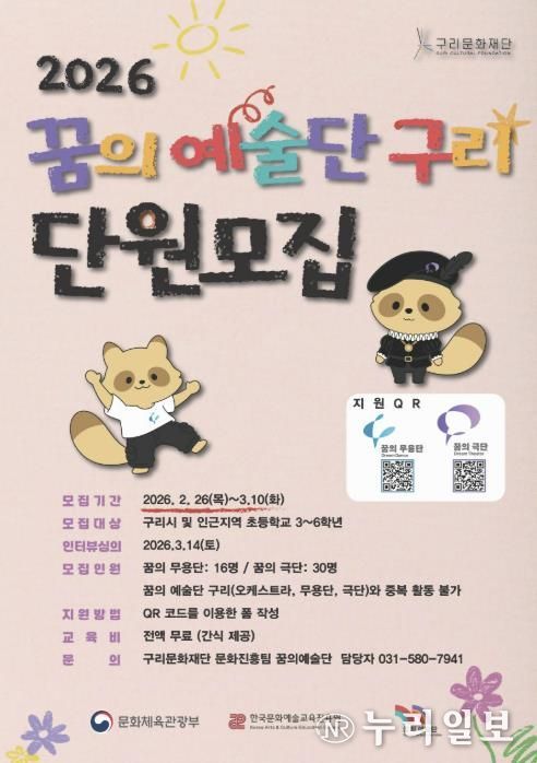 (누리일보) 구리문화재단은 구리시 관내 아동·청소년들이 예술적 상상력을 펼치고 주체적으로 성장할 수 있도록 지원하는 ‘2026 꿈의 예술단 구리’(극단·무용단) 신입 단원을 2월 26일부터 모집한다고 밝혔다.