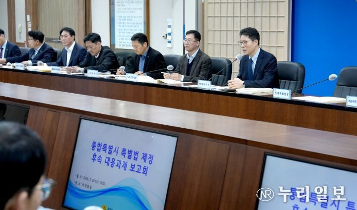(누리일보) 전라남도는 25일 도청 서재필실에서 황기연 행정부지사 주재로 전남광주통합특별시 특별법 후속 대응과제 보고회를 열고, 7월 출범을 앞둔 통합특별시의 안정적 출범을 위한 213개 핵심 과제를 점검했다.