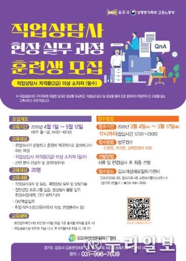 (누리일보) 김포여성새로일하기센터는 고용서비스의 질적 향상과 경력단절 예방을 위해 '직업상담사 현장실무 과정' 훈련생을 모집한다.