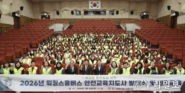 (누리일보) 부천시는 지난 26일 시청 어울마당에서 ‘2026년 어린이통학안전사업(워킹스쿨버스) 발대식 및 안전교육’을 열고 본격적인 사업 추진에 들어갔다. 이날 행사에는 부천시장을 비롯해 안전교육지도사 117명이 참석했으며, 발대식과 직무교육을 통해 어린이 통학 안전 강화 의지를 공유했다.