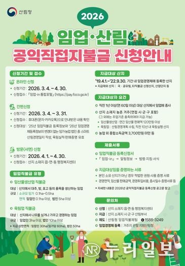 (누리일보) 경상북도는 농업인의 소득 안정을 지원하고, 농업·농촌의 공익적 기능을 강화하기 위해 2026년도 기본형 공익직불금 신청을 3월 1일부터 5월 31일까지 접수한다고 밝혔다.