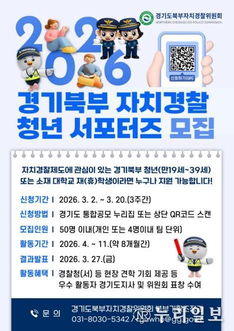 (누리일보) 경기도북부자치경찰위원회는 자치경찰제에 대한 청년층의 관심을 높이고 현장 중심 치안 활동을 함께할 ‘2026 경기북부 자치경찰 청년 서포터즈’를 3월 2일부터 20일까지 공개 모집한다.