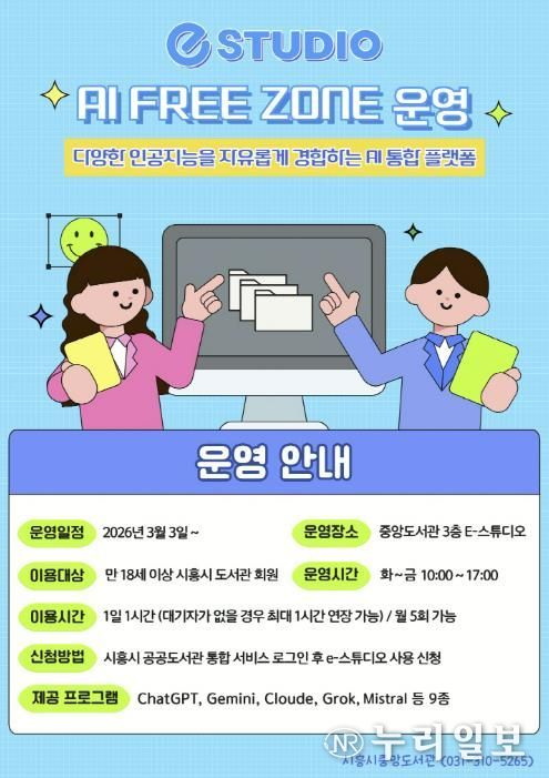 (누리일보) 시흥시중앙도서관은 시민들의 인공지능(AI) 활용 역량 강화를 위해 시 정보통신과와 협업해 도서관 3층 e-스튜디오에 ‘인공지능(AI) 프리 존(Free Zone)’을 구축하고, 오는 3월 3일부터 본격 운영에 들어간다.