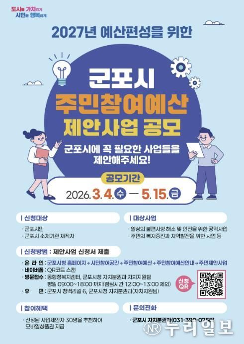 (누리일보) 군포시는 3월 4일부터 5월 15일까지 ‘2027년 예산편성을 위한 주민참여예산 제안사업’을 공모한다.