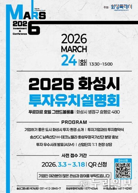 (누리일보) 화성특례시가 오는 3월 24일 푸르미르 호텔에서 ‘2026 화성특례시 투자유치 설명회’를 개최하고, 3월 3일부터 3월 18일까지 QR코드를 통한 사전접수를 진행한다.