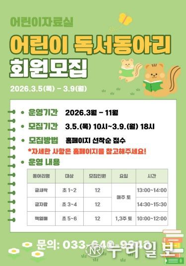 (누리일보) 강릉교육문화관은 초등학생들을 대상으로 3월 14일부터 2026년 어린이 독서동아리를 운영한다.