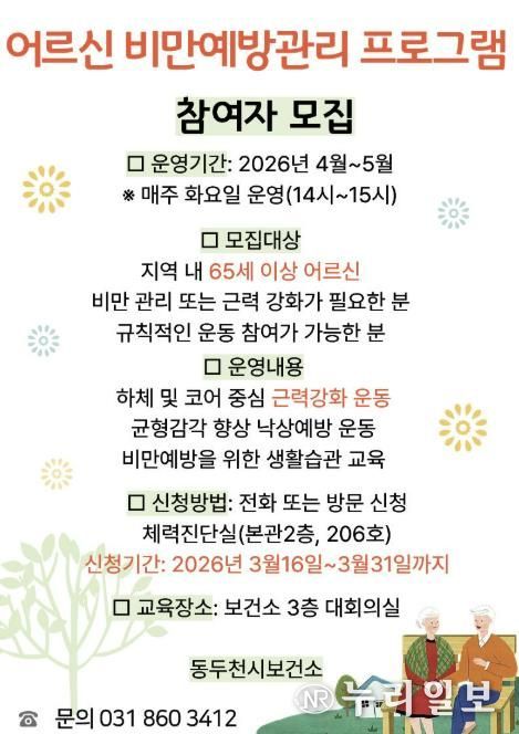 (누리일보) 동두천시 보건소는 오는 4월부터 어르신의 비만 예방과 근력 강화를 통한 낙상사고 예방을 위해 ‘어르신 비만예방관리 사업’을 추진한다.