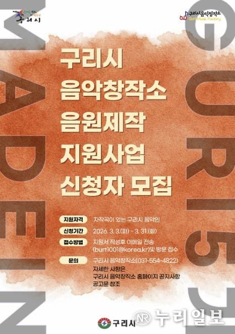 (누리일보) 구리시는 3월부터 추진하는 구리시 음악창작소 지역 아마추어 음악가 음원 제작 지원사업 '2026 Made in Guri(메이드 인 구리)’참여자를 모집한다고 밝혔다.