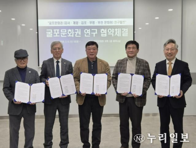 (누리일보) 부천문화원과 강서문화원, 계양문화원, 김포문화원, 부평문화원은 3월 4일 부천문화원에서 ‘굴포문화권’을 토대로 하는 연구교류 협약식을 체결했다. 이로써 ‘굴포’를 같은 문화권으로 하는 부천문화원·강서문화원·계양문화원·김포문화원·부평문화원은 학술대회와 콘텐츠 발굴 사업 등 다양한 지역학 자원을 발굴하고 활성화하기 위해 최초로 지역학 연구 모델을 구축하게 됐다. 특히, 이번 협약은 경기도(부천, 김포), 서울특별시(강서), 인천광역시(계양, 부평)를 잇는 ‘지역학’중심의 연구 교류를 마련한다는 점에서 주목된다.