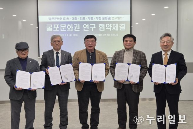 (누리일보) 부천문화원과 강서문화원, 계양문화원, 김포문화원, 부평문화원은 3월 4일 부천문화원에서 ‘굴포문화권’을 토대로 하는 연구교류 협약식을 체결했다. 이로써 ‘굴포’를 같은 문화권으로 하는 부천문화원·강서문화원·계양문화원·김포문화원·부평문화원은 학술대회와 콘텐츠 발굴 사업 등 다양한 지역학 자원을 발굴하고 활성화하기 위해 최초로 지역학 연구 모델을 구축하게 됐다. 특히, 이번 협약은 경기도(부천, 김포), 서울특별시(강서), 인천광역시(계양, 부평)를 잇는 ‘지역학’ 중심의 연구 교류를 마련한다는 점에서 주목된다.
